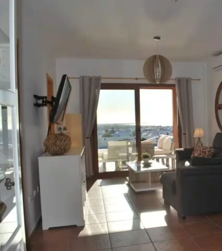 From the hallway, you can also step directly into the open-plan living and dining area with a fully equipped kitchen. The large sliding doors with expansive windows provide views of the garden, terrace, pool, and Jacuzzi. From the living room, you can also catch a glimpse of the ocean and distant Fuerteventura.